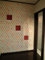 桜ヶ丘の家 木造2階建て42坪 こげ茶色と白色で外部・内部ともまとめています。 玄関の壁はインパクトのあるカラフルな葉っぱ柄です。